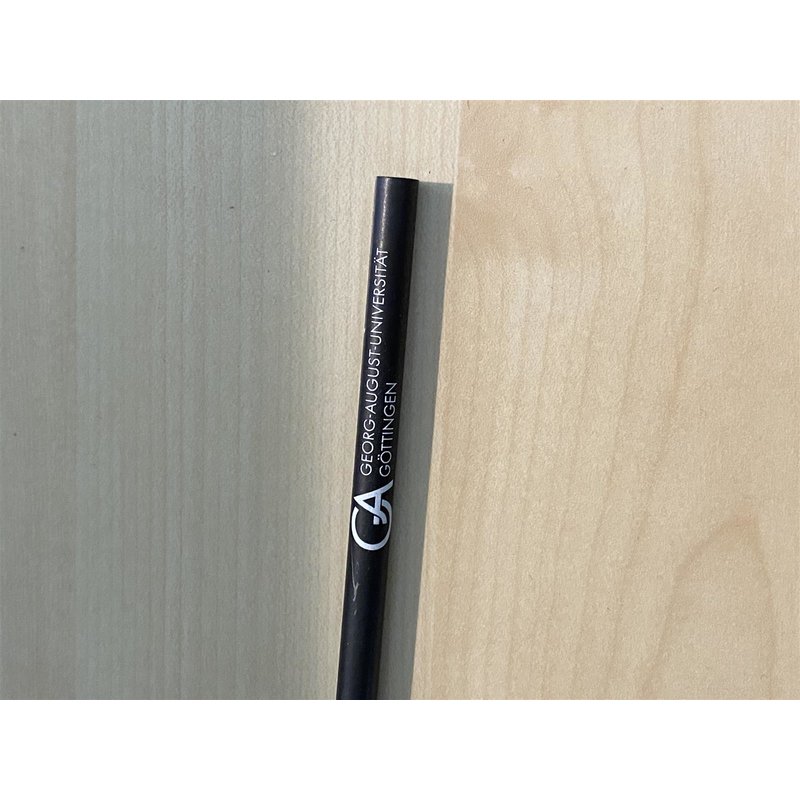 Dieser Bleistift fällt auf durch sein edles Design. Er ist schwarz durchgefärbt mit silberfarbenem Ende. Das Uni-Logo ist ebenfalls in silber aufgedruckt.