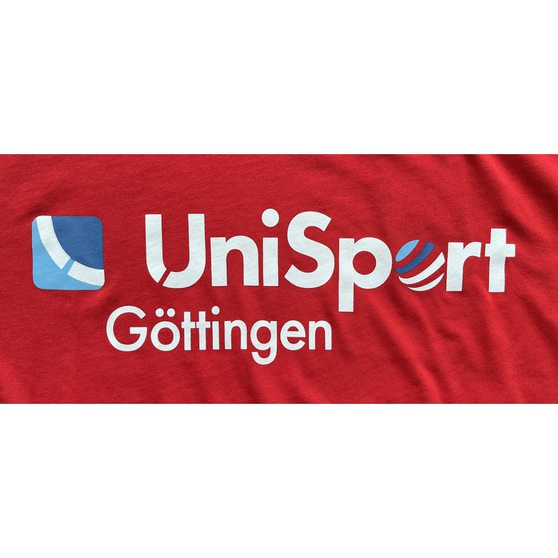 Veredelung: dreifarbiger Siebdruck: großer Brustdruck mit Logo UniSport Göttingen